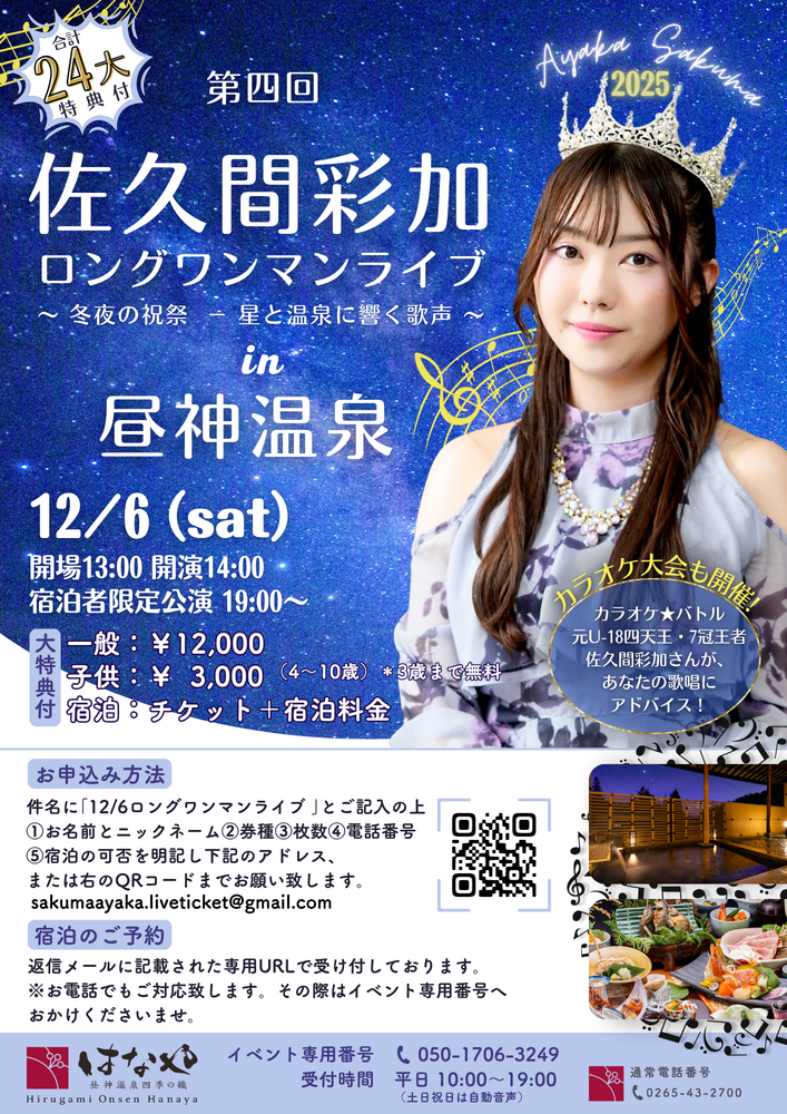 第4回 昼神温泉ホテル貸切ロングワンマンライブ🌠 SCHEDULE 2025/12/06(土) 13:00 - 2025/12/07(日) 11:00 ご予約は↓までお願いいたします URLをコピーする 報告する